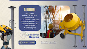 A Locadora Macedo é especializada no aluguel de equipamentos para construção civil, oferecendo andaimes, escoras metálicas, betoneiras, compactadores de solo, plataformas e caixas d’água em Seabra e cidades vizinhas como Campestre e Boninal. Todos os equipamentos são modernos, bem conservados e garantem praticidade e segurança em cada etapa da obra. Com agilidade na entrega e compromisso com o prazo, a empresa se destaca pelo atendimento próximo, pontualidade e confiança, tornando-se a parceira ideal de pedreiros, construtores e empresas que buscam eficiência e qualidade em suas construções.